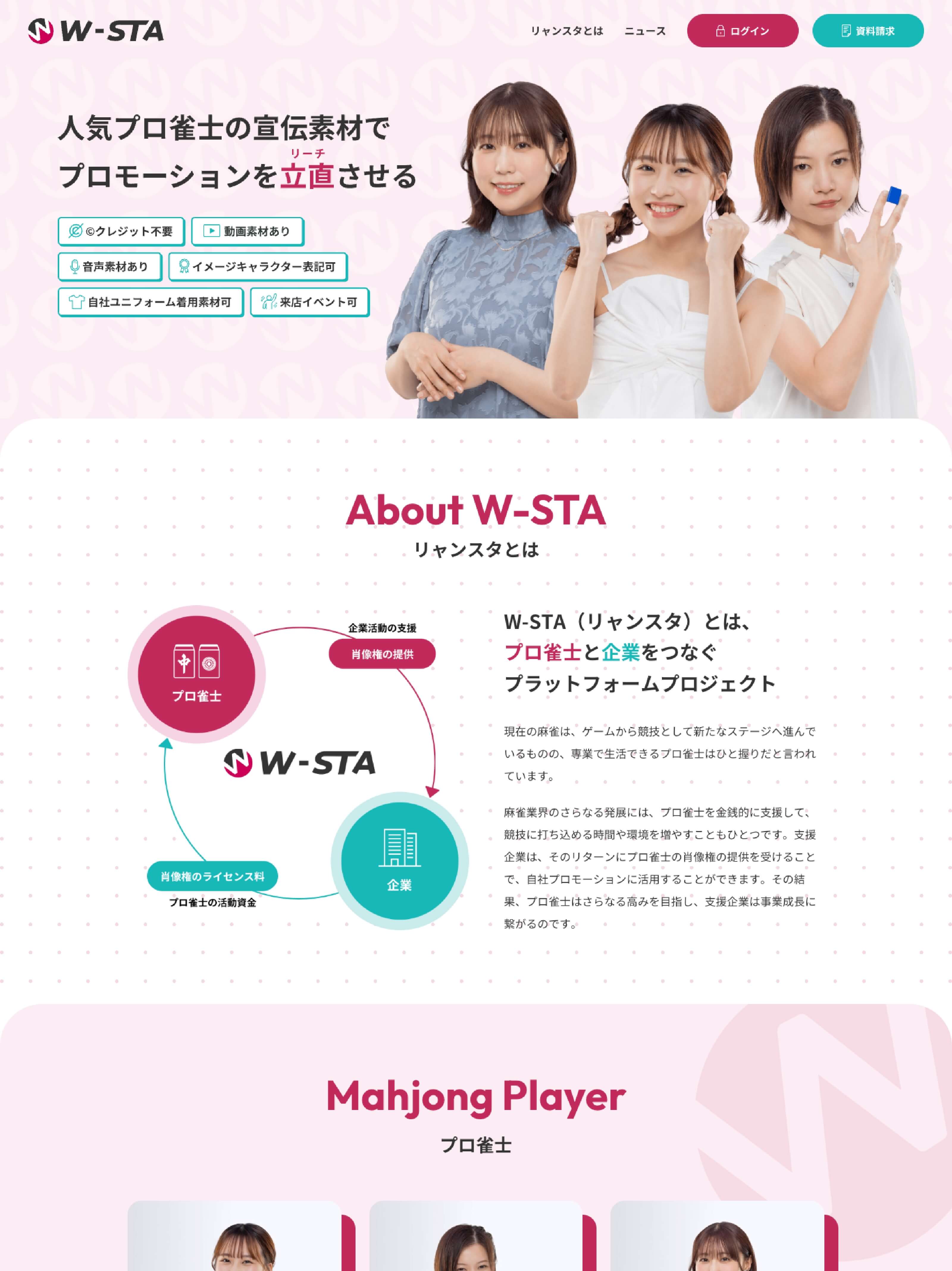 株式会社パック・エックス様より、新規サービス「W-STA」の立ち上げに伴うWebサイト制作をご依頼いただきました。本サービスは、人気プロ麻雀士の写真・動画・音声・グラフィックなどの素材をご契約いただいた企業様に自由にご利用いただける素材サイトです。これまで採用支援など人材領域のイメージが強かった同社にとって、まったく新しい収益モデルとなる取り組みであり、単なるWeb制作ではなく、会員制ビジネス全体の仕組みをゼロから構築する必要がありました。